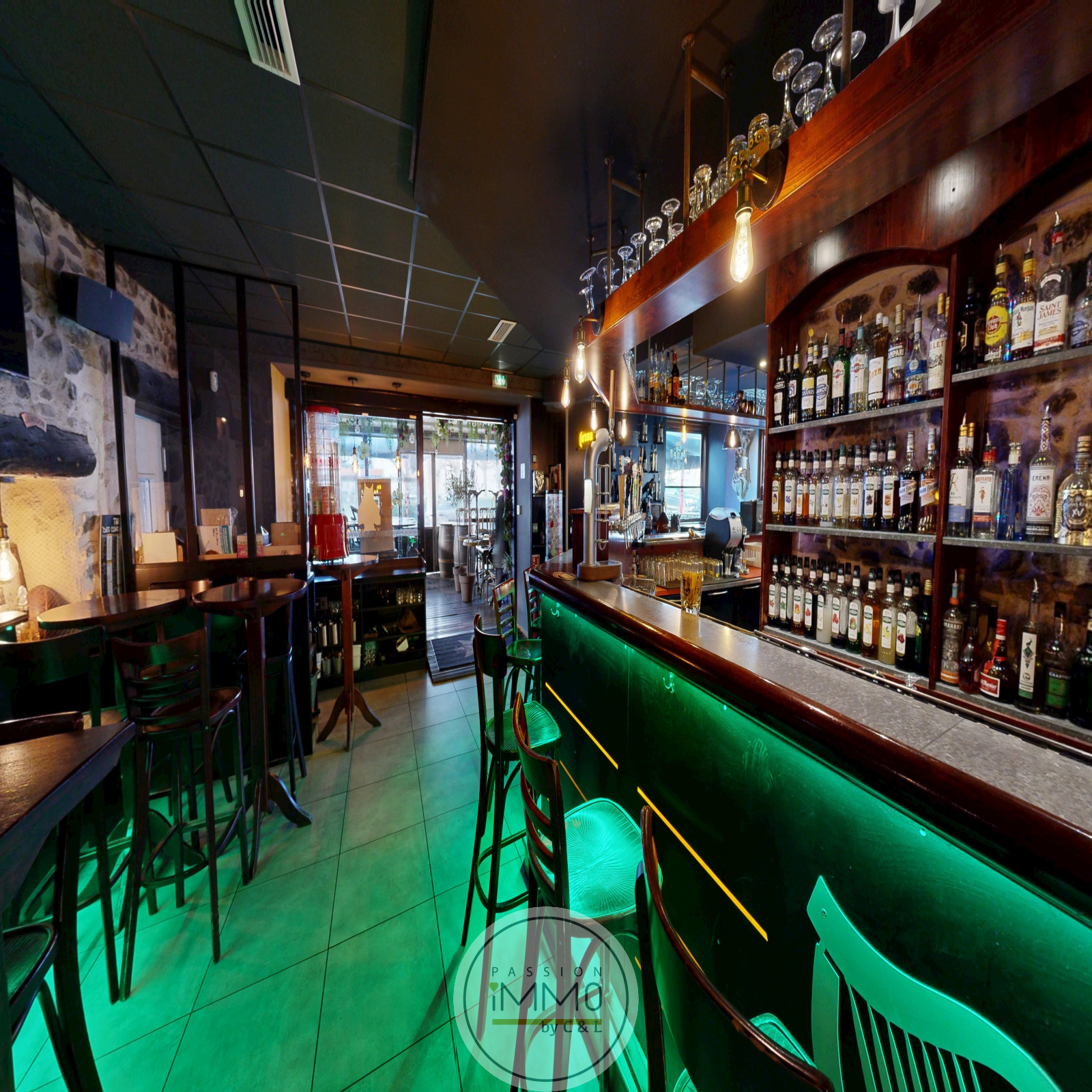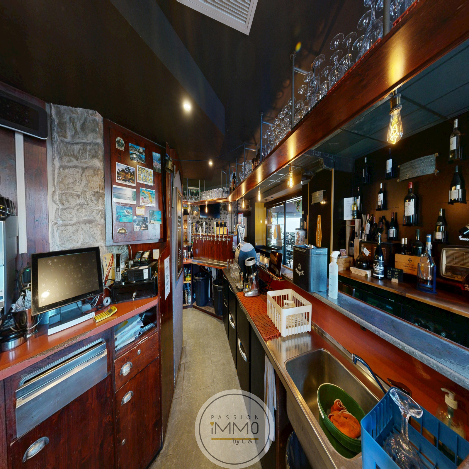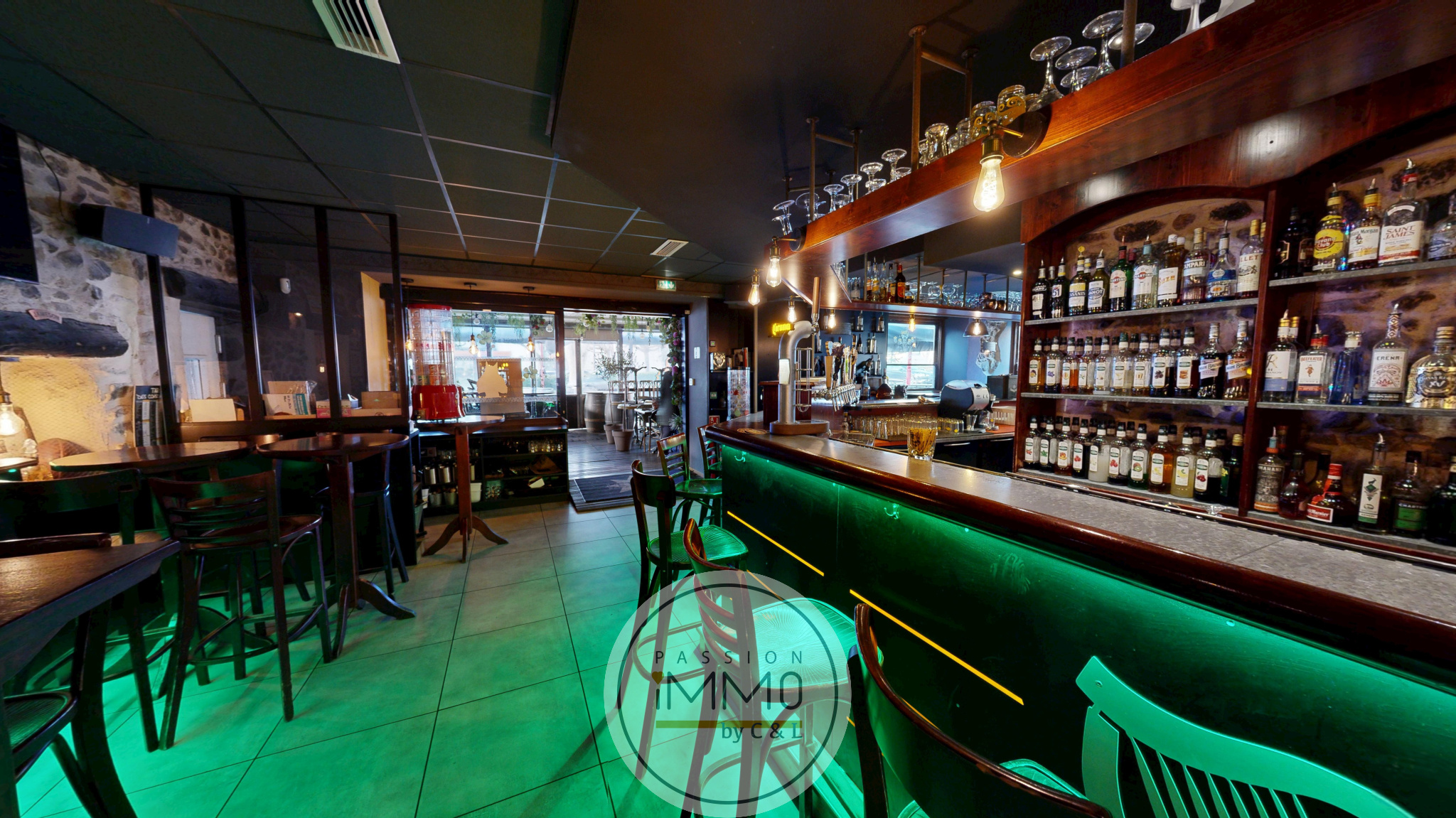 Le commerce se compose, d’une salle de café (espace bar), une salle de restauration, une cuisine, un débarras, ainsi que d’une cave permettant le stockage et l’entreposage des marchandises.